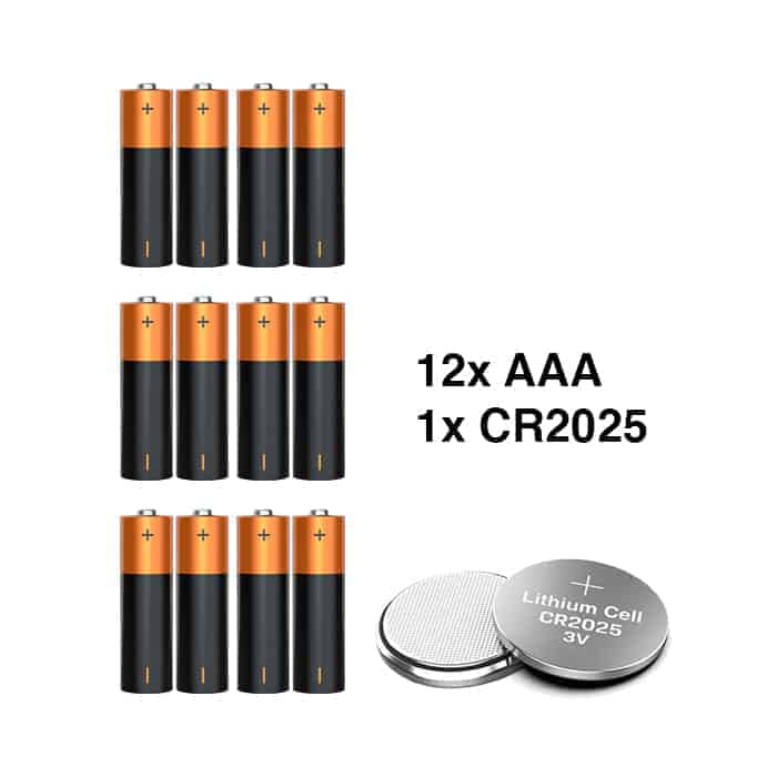 A Csomag Tartalma: 12x AAA elem + 1x CR2025 elem