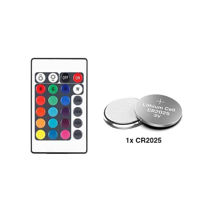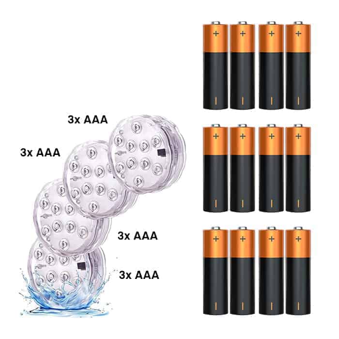 A készlet 12 db AAA elemet tartalmaz 4 lámpához és 1 db CR2025 elemet a távirányítóhoz. Így nem kell elhagynia otthonát, és azonnal használhatja a GlowWaterLights LED lámpákat.
