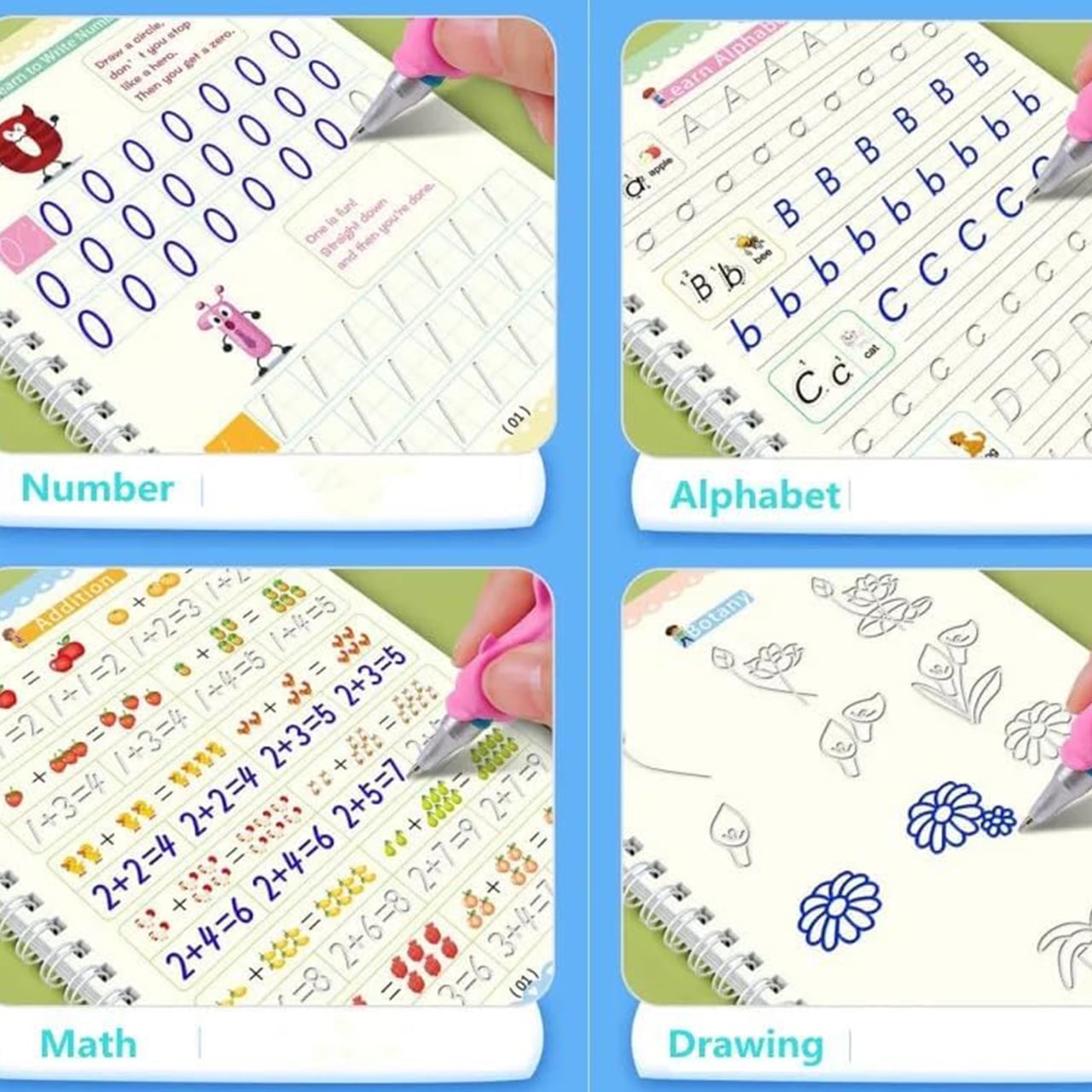 - 4 különböző füzet: számok, Rajz, Matematika, Angol ABC</li>