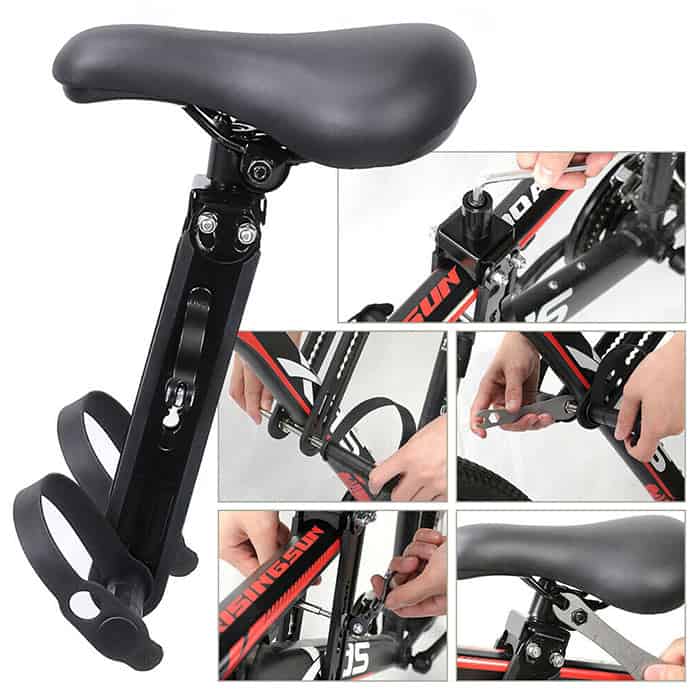 Egyszerűen szerelje fel a gyermek kerékpárülést a bicikli elejére! Az ülés biztonságos és a gyermek élvezheti a nagyszerű kilátást a biciklizés közben!