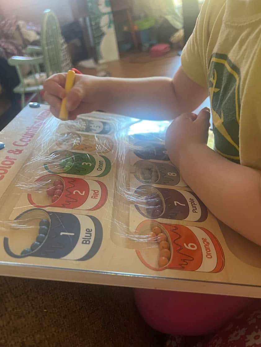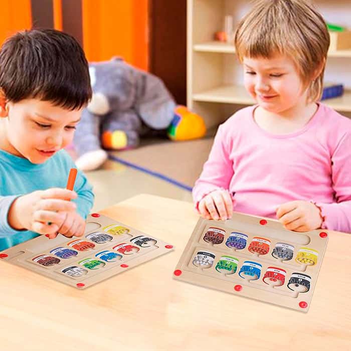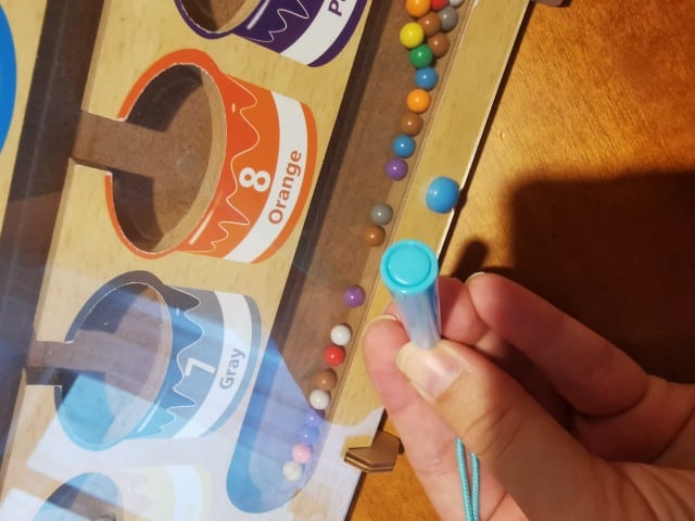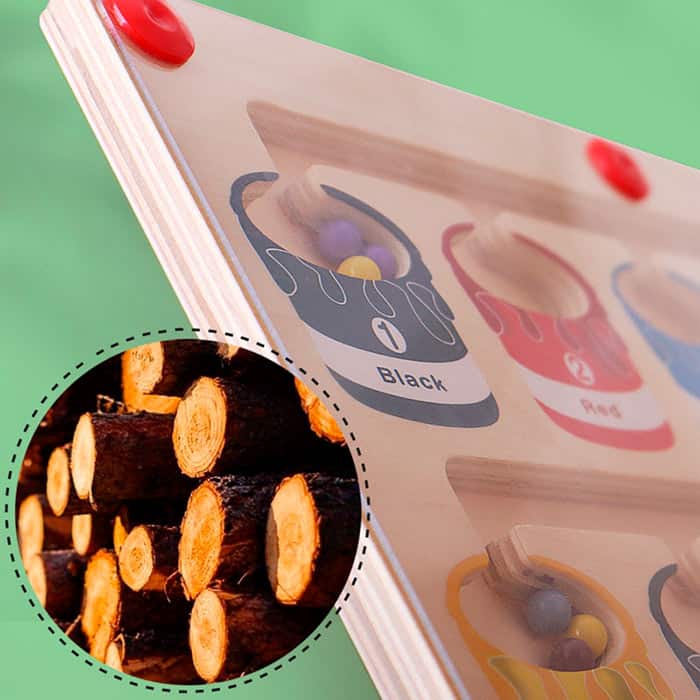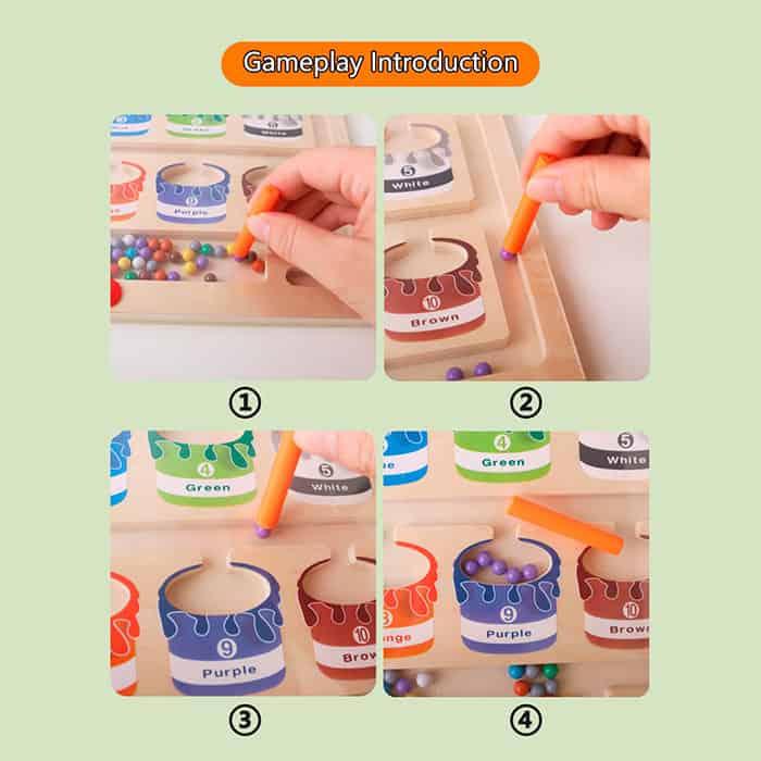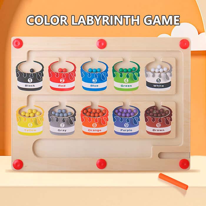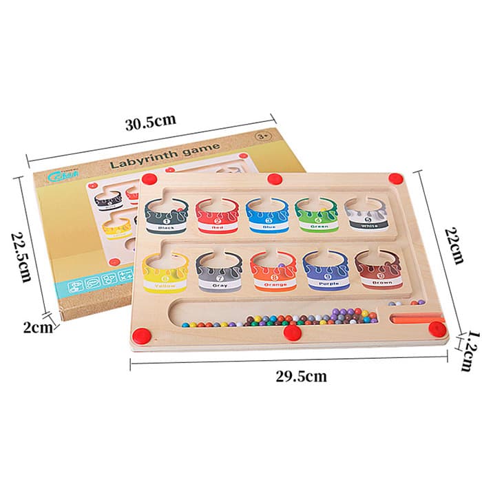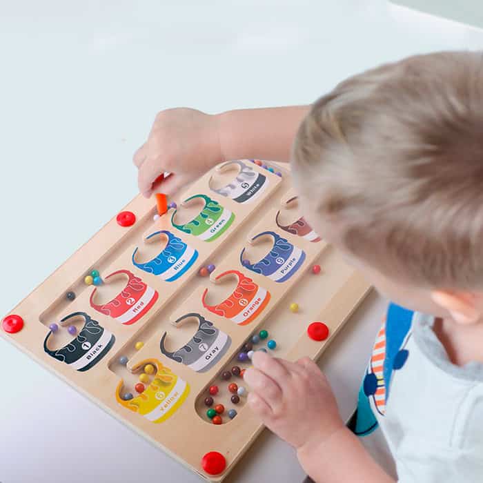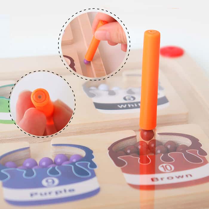 A mágneses oktatójátéknak van egy pálcikája, amelynek segítségével a gyermek a színes golyókat a megfelelő mezőkbe rendezi!