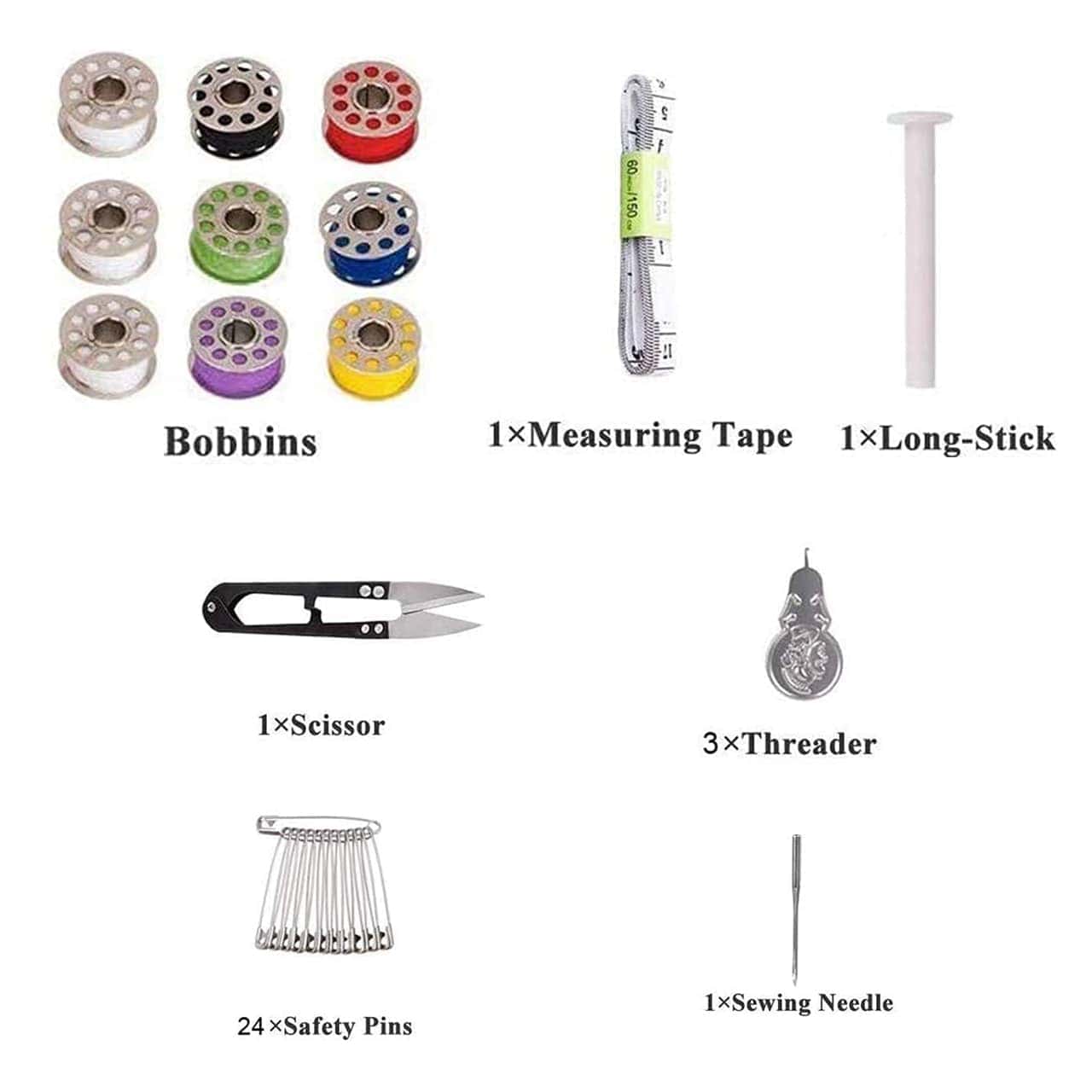 A csomagban: 8x cérna különböző színekben, 1x mérőszalag, 1x cérnavágó olló, 1x biztosítótű készlet, 1x tű, 1x tűfűző
